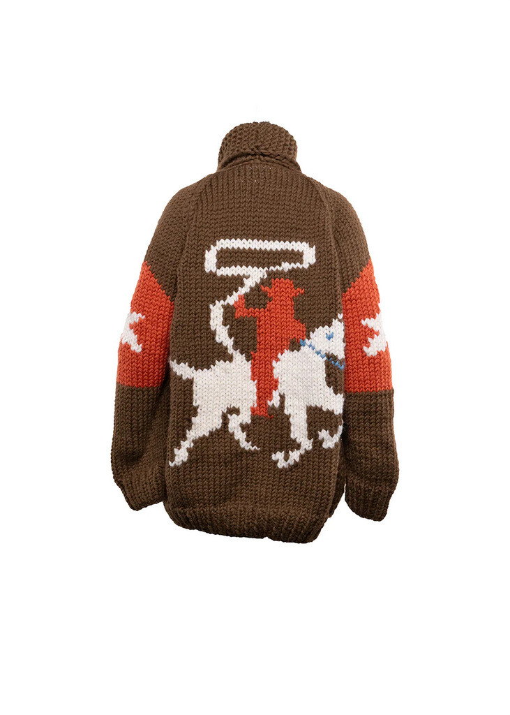 The cowboy is one of GOGOs best selling pieces. A cowboy motif on the classic cardi body. Straight body and arms, side pockets, shawl collar 3-4 porcelain buttons.