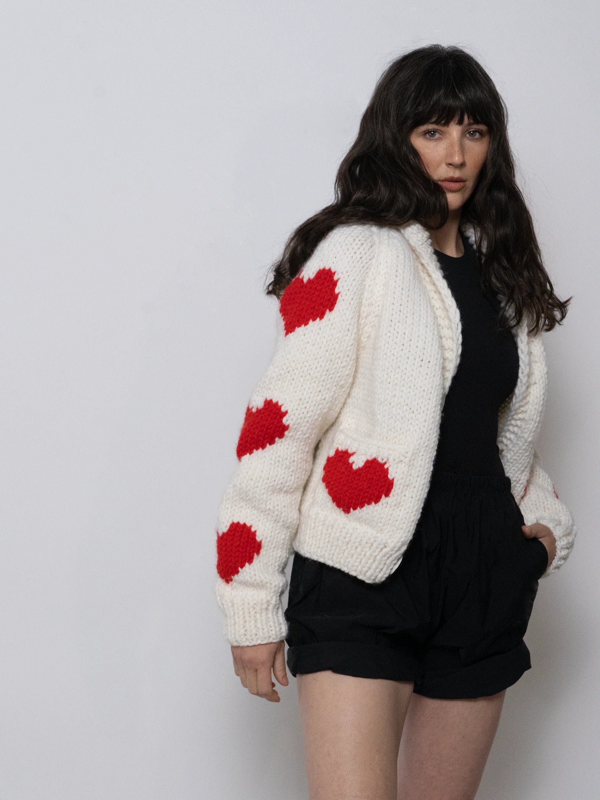 The Classic Heart Cardigan everyone knows and loves in new fresh colours for this season. Featuring the classic straight body and sleeve, raglan shoulder and shawl collar. Slouchy patch pockets on the lower front of each side. One large heart on centre back and one smaller heart on wearer's left.