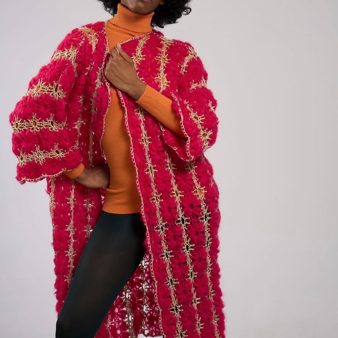 Enhance your style with this hand-knitted cardigan boasting an ombré effect in distinctive shades, complemented by a charming floral pattern.The unique combination of ombré hues and floral design makes it a standout piece, perfect for those seeking a fashion-forward statement.