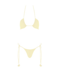 The Arazo two-piece highlights softly ruched cups and ultra-thin straps for versatile styling, paired with low-rise bottoms featuring delicate side ties, adorned with rosebud accents.