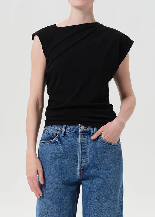 The Beth Tee features an asymmetrical neckline and cap sleeve for a subtle twist on the everyday tee. Cut from lightweight, ultra-soft organic cotton jersey in true black, it’s both minimal and elevated. Pair with high-rise denim or trousers for a clean, modern look.