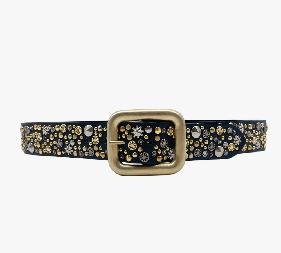 Add a chic touch to your outfit with this black Italia leather belt, designed on a light gold center bar buckle and detailed with mixed metal studs.