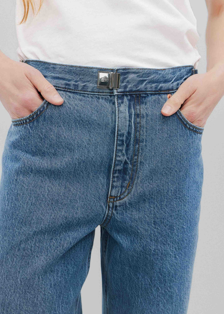 The Buckle Jean is a relaxed leg, subtle drop-crotch with a 31" inseam. It features our custom chrome buckle hardware and adjustable waistband side fasteners, allowing it to be worn as both a mid or low-rise jean.