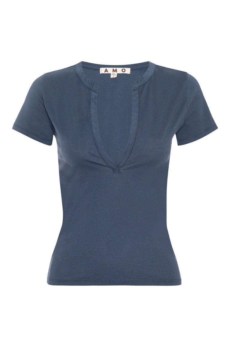 A lived-in tee with a deep notched neckline and cap sleeves. Fitted through the body with just the right amount of edge.