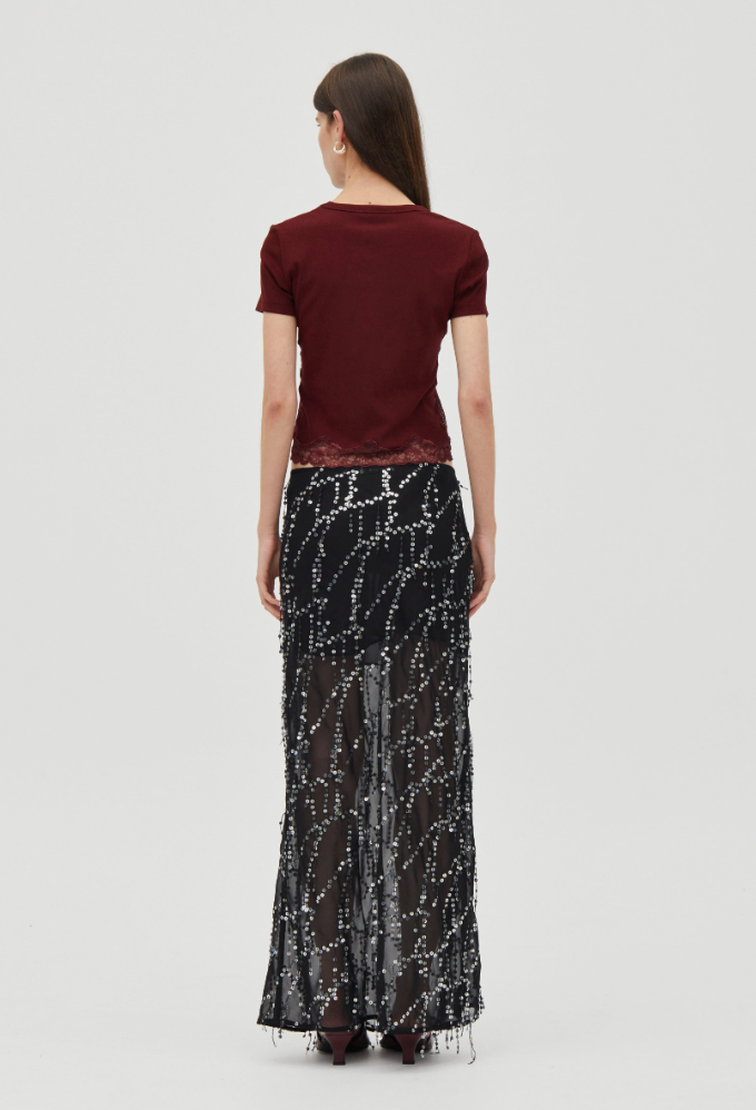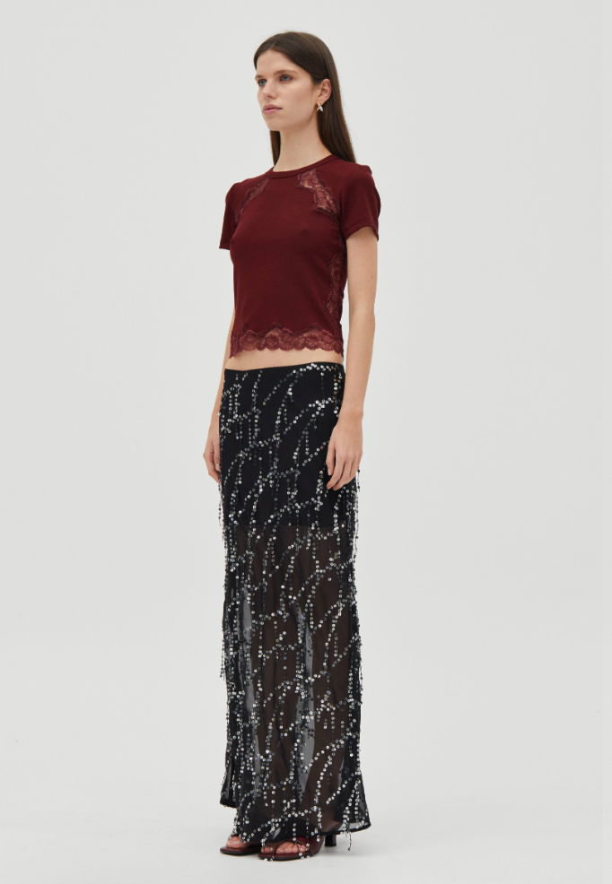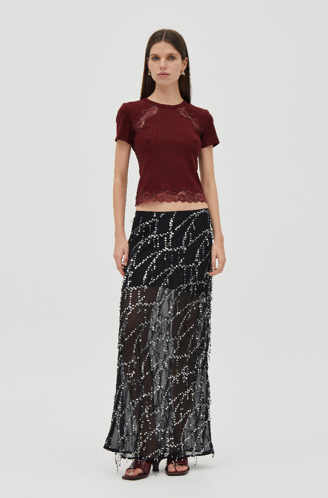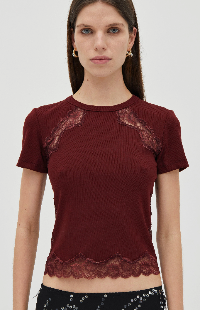 The Echo Tee is a fitted baby tee crafted from a soft ribbed jersey. Sheer lace panelling traces through the body and finishes at the hem, adding contrast to the silhoutte. Designed as a pull-on style, it’s an easy layering piece.