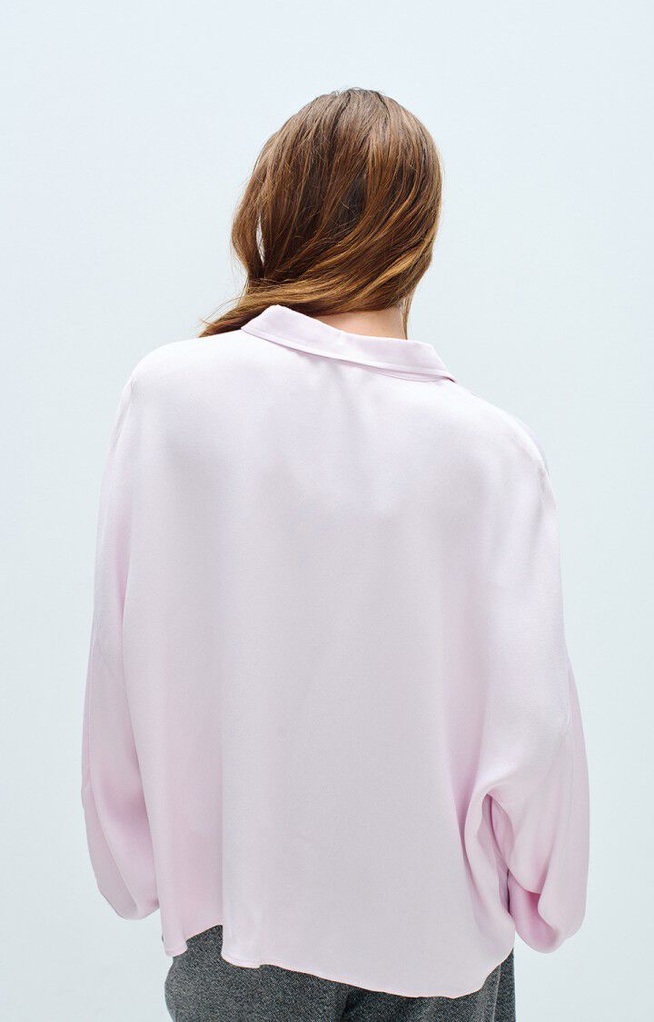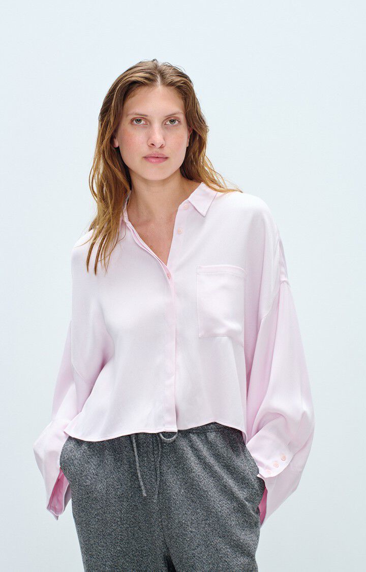 The Tidim shirt revisits a wardrobe essential with a graphic and contemporary twist. Its cropped, asymmetrical cut creates a loose, structured silhouette, adding character to the look. Crafted from a flowing fabric with an elegant drape, it features long sleeves with a retro feel, highlighted by delicate button detailing. A refined and easy-to-wear piece that plays on the contrasts between modernity and timeless elegance.